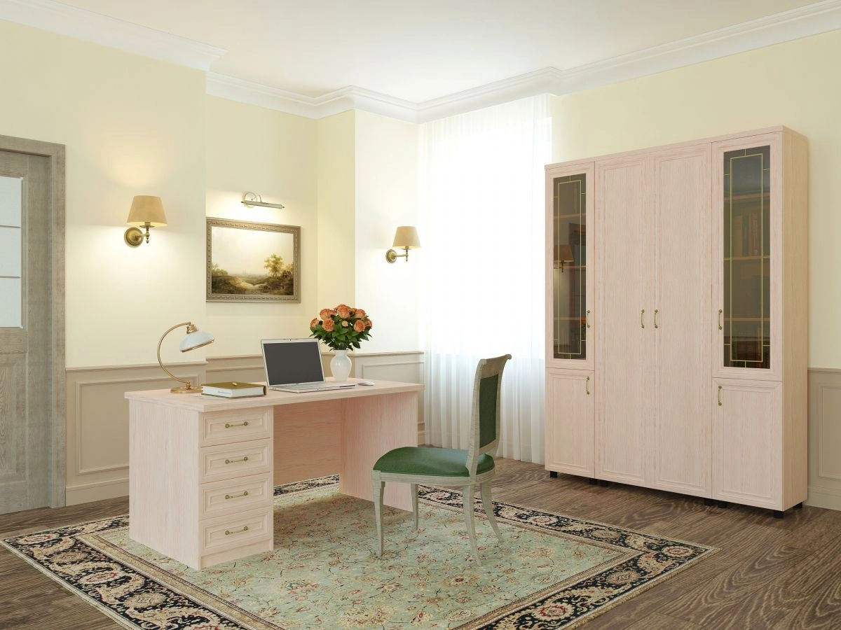 Комплектация: направляющие на ящиках - шариковые (100%), топ и столешница ЛДСП 32 мм, задняя стенка ХДФ (ламинированная), рамка МДФ (фигурная), стекло бронза 4 мм с витражом, опора регулируемая - цвет чёрный, ручка скоба 96 мм - латунь