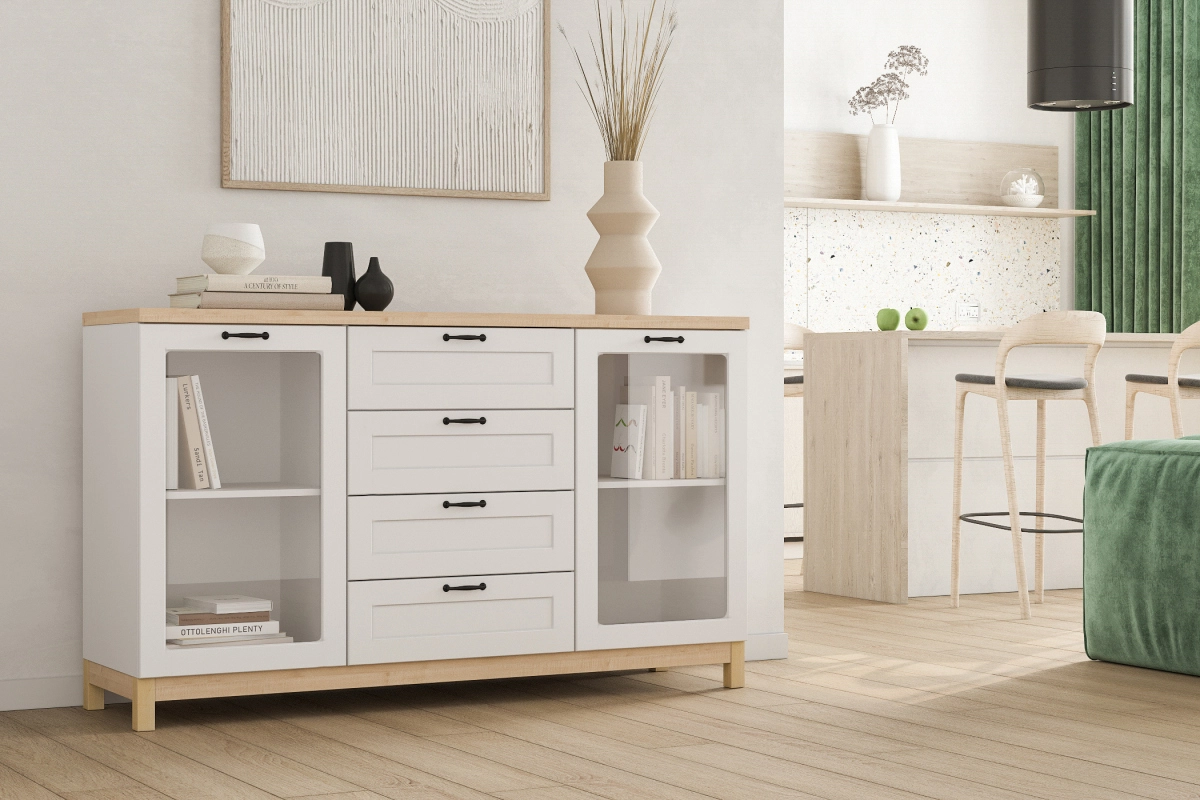 Комплектация: направляющие шариковые 100% выдвижения, фасады с фрезеровкой, петли без доводчика, ножки массив дерева, стекло простое