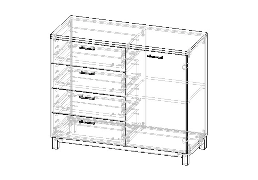 Комплектация: направляющие шариковые 100% выдвижения, фасады с фрезеровкой, петли без доводчика, ножки массив дерева