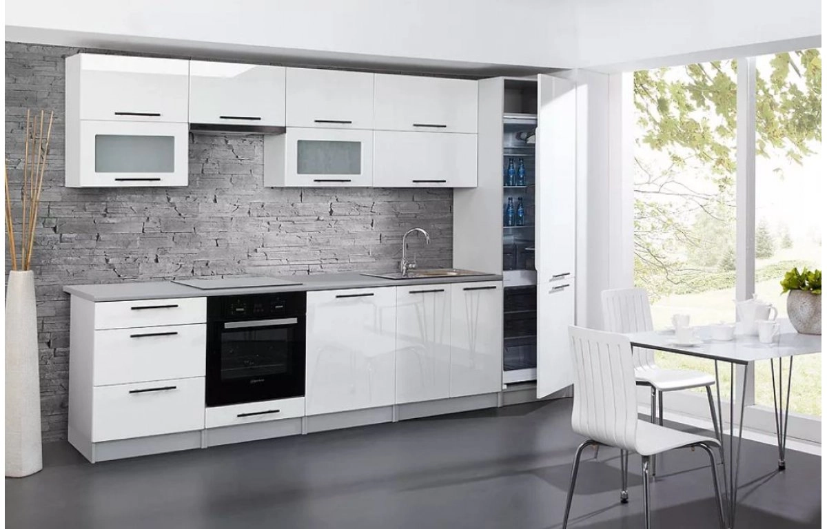 Комплектация: корпус - ЛДСП 16 мм с кромкой ПВХ 0,4 мм, фасад - МДФ 19 мм эмаль глянец, задняя стенка - ХДФ 3 мм (цвет БЕЛЫЙ), столешница (влагостойкая) - 38 мм, пристеночный литой плинтус - в цвет столешницы, посудосушитель - хром, цоколь ПВХ - 150 мм в цвет корпуса, петли с доводчиком, навесы регулируемые, шина монтажная, опоры - 150 мм, ручка по фото, ящик - металлобокс без доводчика
