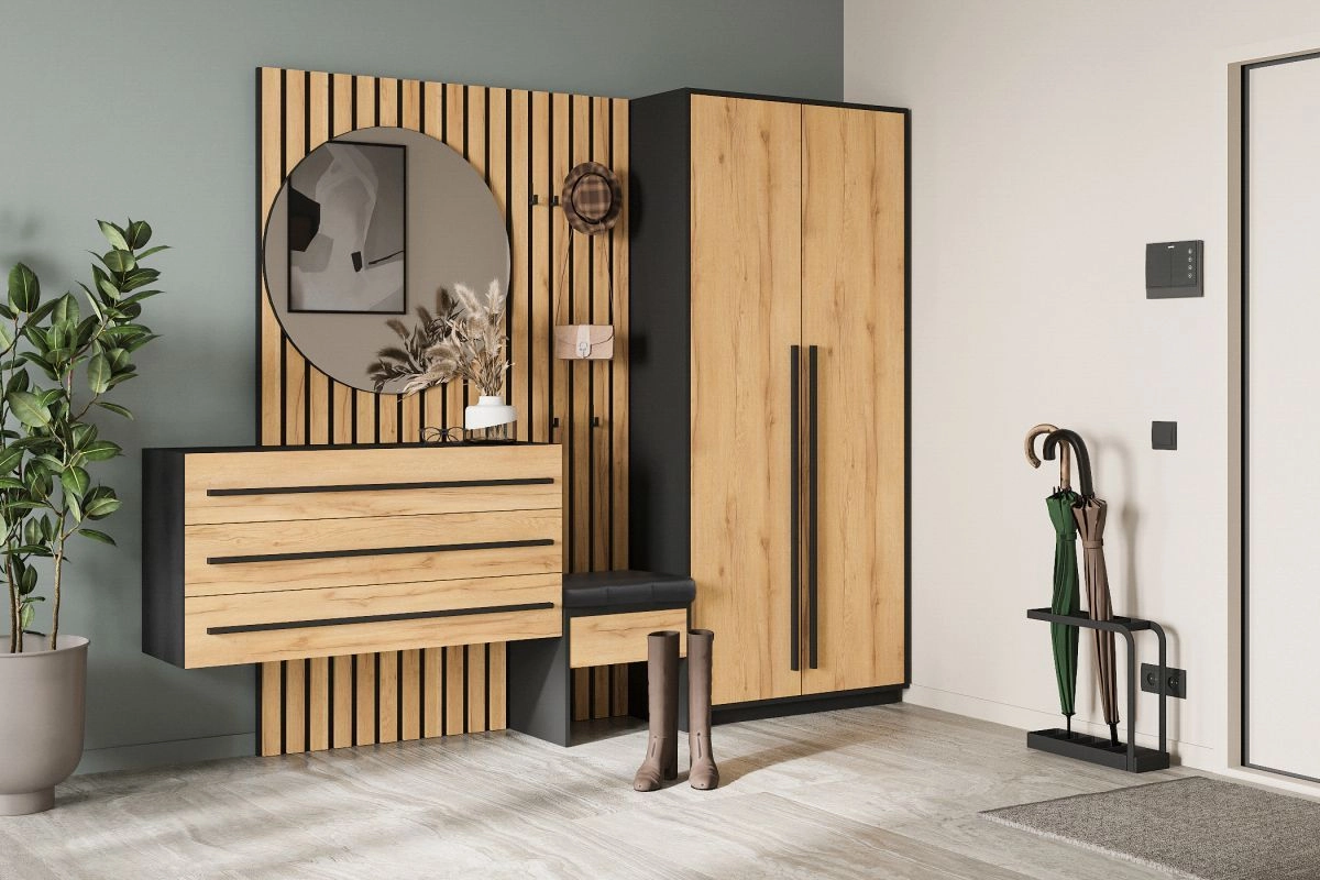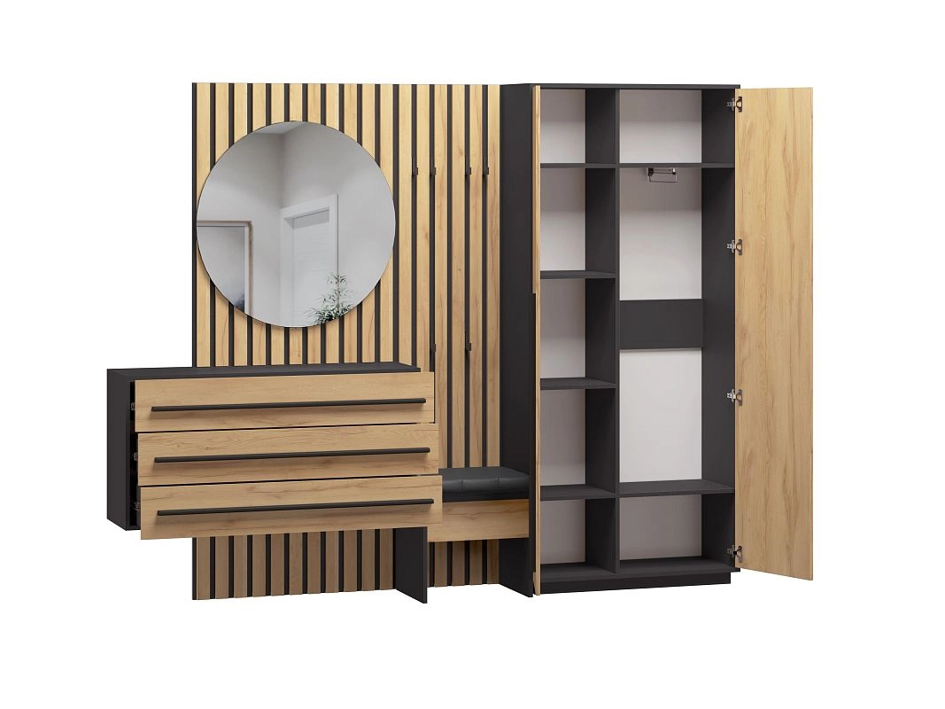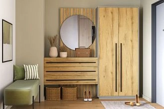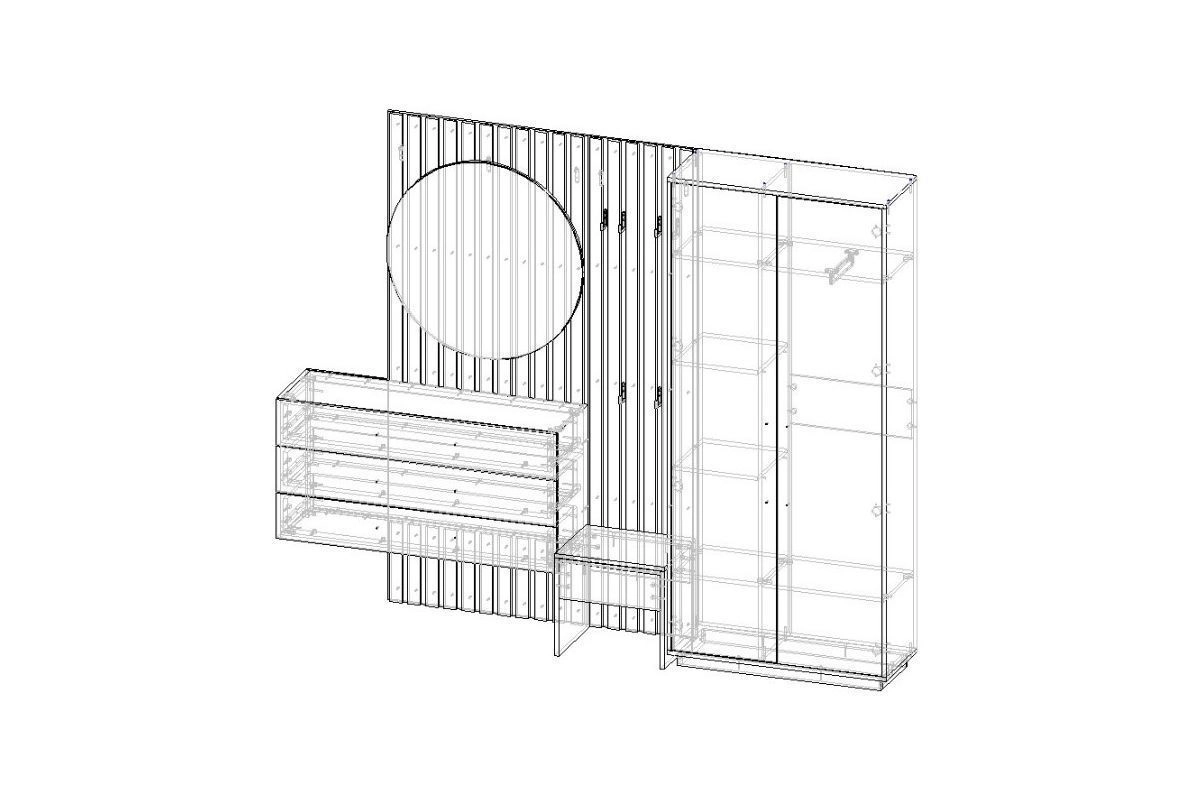 ЛДСП 16мм. Кромка в цвет корпуса. Направляющие на выдвижные ящики 100%. Штанга выдвижная 300мм. Мягкий элемент сидушки. Стекло с пленкой Orakal на столешнице подвесной тумбы. Крючки арт.07215, ручки на шкаф арт.39215, ручки на комод арт. 39212.