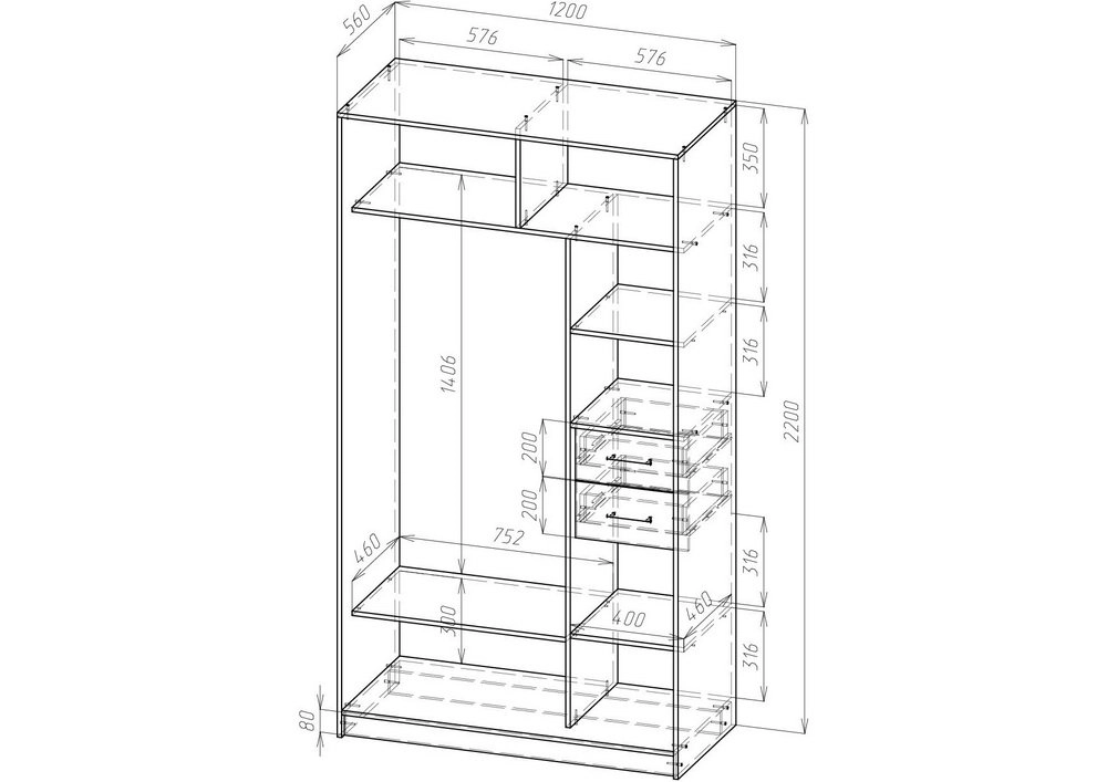 3. Если высота шкафа превышает 2200 мм, рекомендуется добавить дополнительную полку в секцию с полками.