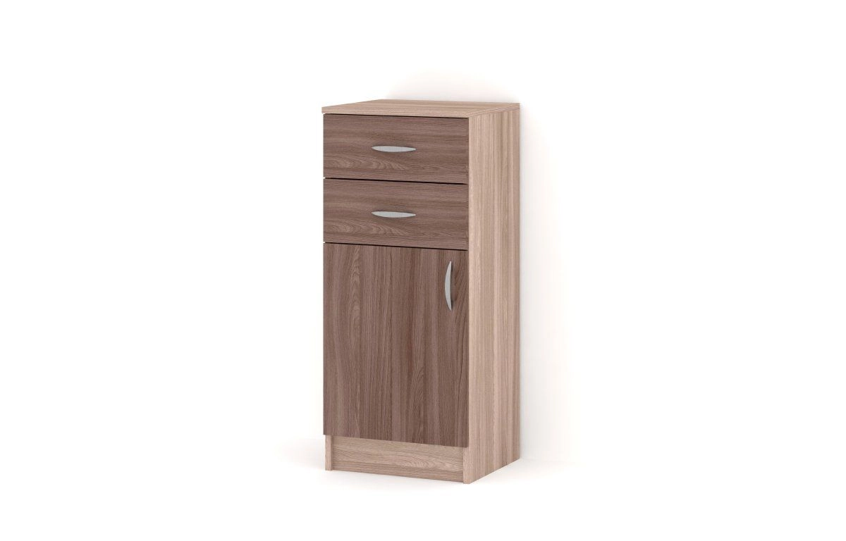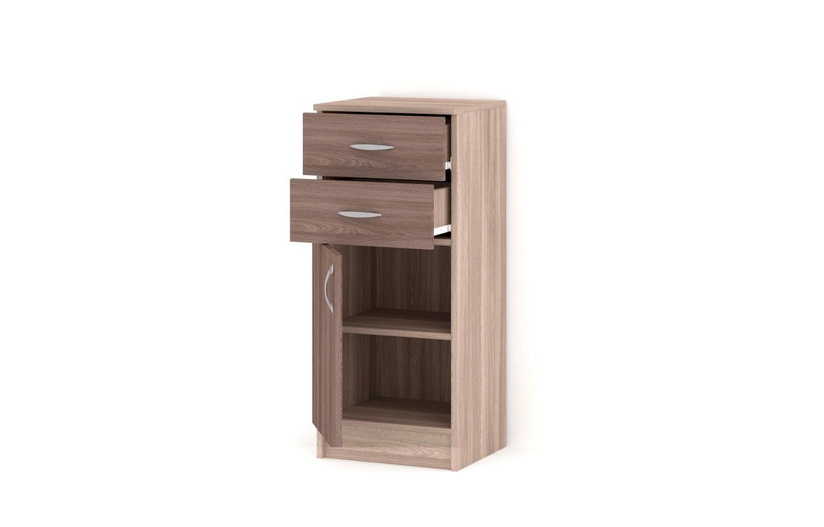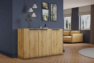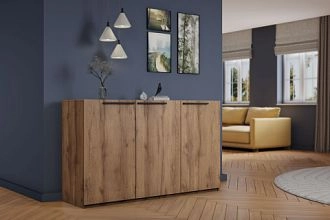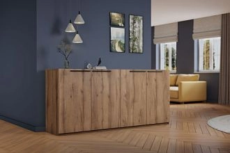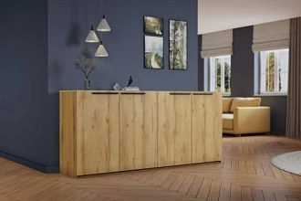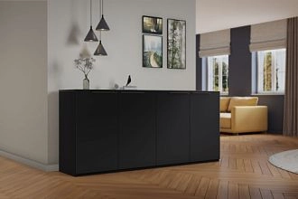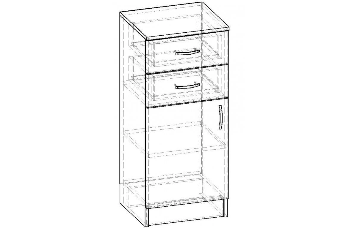 Комплектация: корпус, полки и фасады изготовлены из ЛДСП 16 мм с кромкой ПВХ 0,4 мм, задняя стенка ХДФ (ламинированная), металлические ручки-скобы, направляющие роликовые, петли на фасадах металлические, угол открывания 90 градусов, без доводчиков