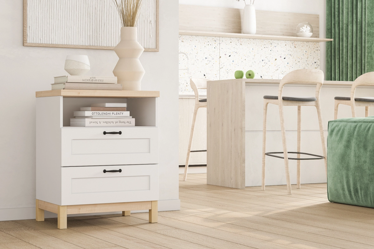 Комплектация: шариковые направляющие 100% выдвижения, фасады с фрезеровкой, ножки массив дерева